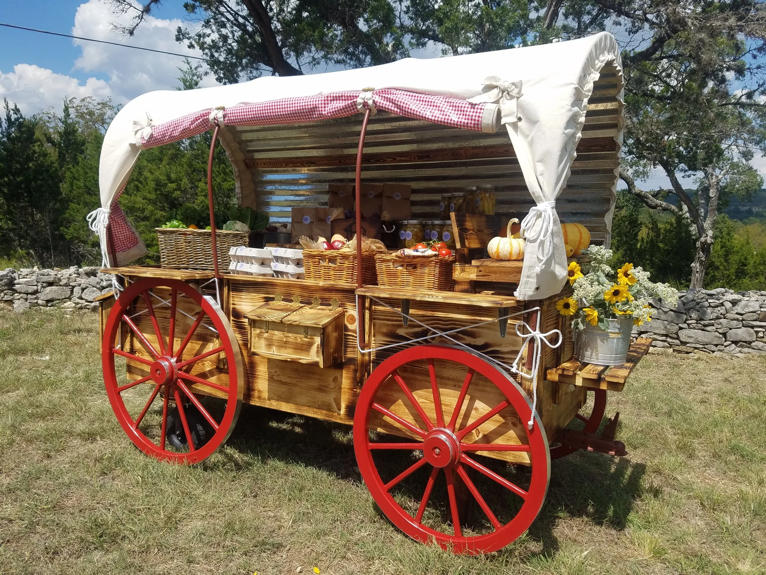 Specs: 5’ x 11’ Mobile wagon box (backyard tow utility). Wood slatted tabletop vending platform. Corrugated metal roof and back. Rear cargo box with lid. Cash box. Golden Burn Finish. Red wheels. Red Check Lining.